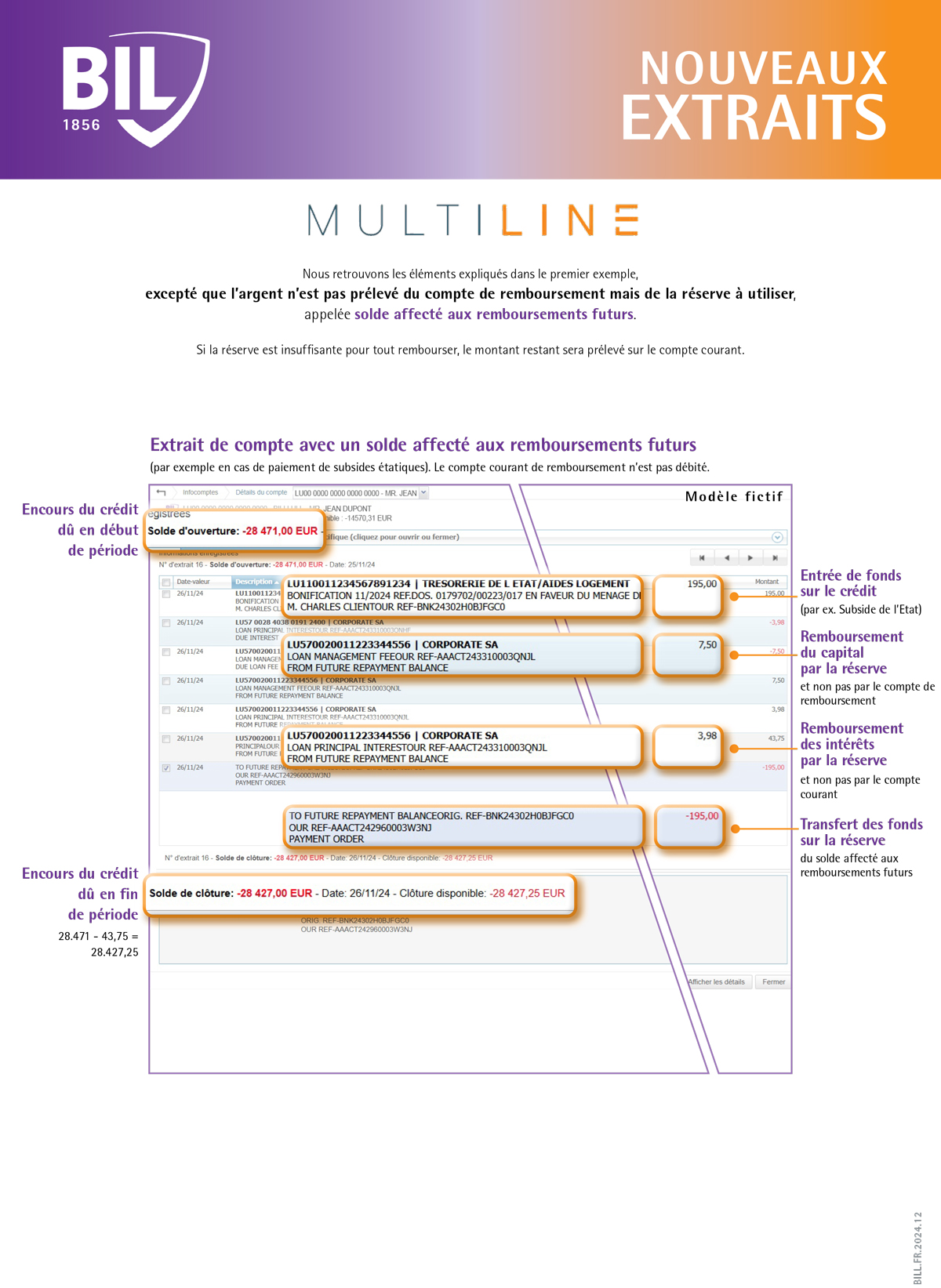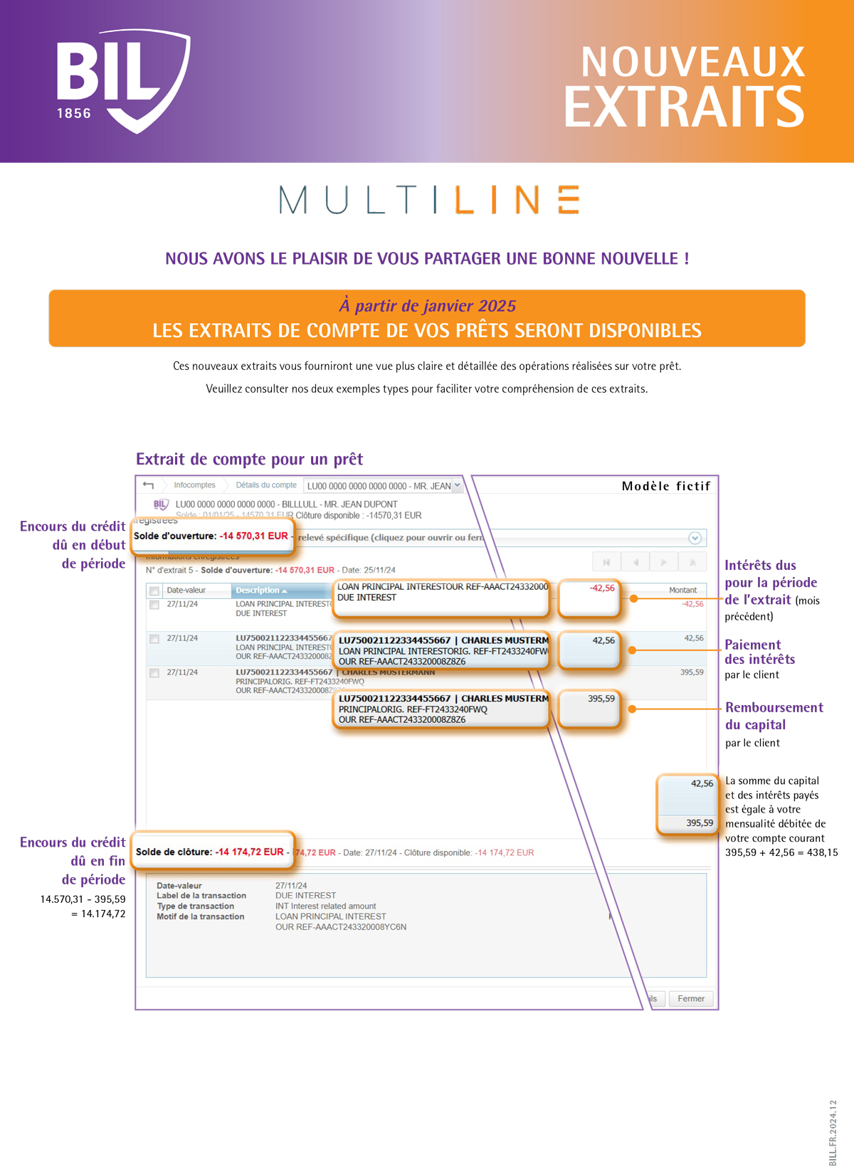 Dès janvier 2025, vos extraits de comptes de prêts seront de nouveau accessibles dans MultiLine. Vous pourrez consulter et télécharger les extraits de compte au format MT940E directement depuis votre espace MultiLine. De plus, l'historique des mouvements accessibles avant le 30 septembre 2023 sera également réintroduit, vous permettant ainsi de retrouver toutes vos informations liées à vos crédits.